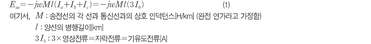 [그림1]에 나타낸 것과 같이 송전선의 각 선에 Ia, Ib, Ic 의 전류가 흐르고 있을 때 이와 병행해서 가설된 통신선이 받는 전자유도전압 Em 은 송전선의 각 선과 통신선과의 상호 인덕턴스 M 일때 식(1)과 같이 계산할 수 있다.