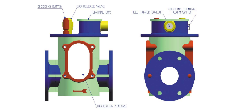 차단용 접점은 갑자기 발생된 과압력에 의한 유속을 검출하는 장치로 1±0.15 m/sec의 속도로 절연유가 흐를 때 동작 됩니다. 이 계전기의 차단신호가 발생하면 일단 변압기의 운전을 중지한 후 변압기를 재검 해야 합니다. 과도한 유속은 변압기 내부 철심의 과열이나 아크방전 등에 의해 발생되기 때문입니다.