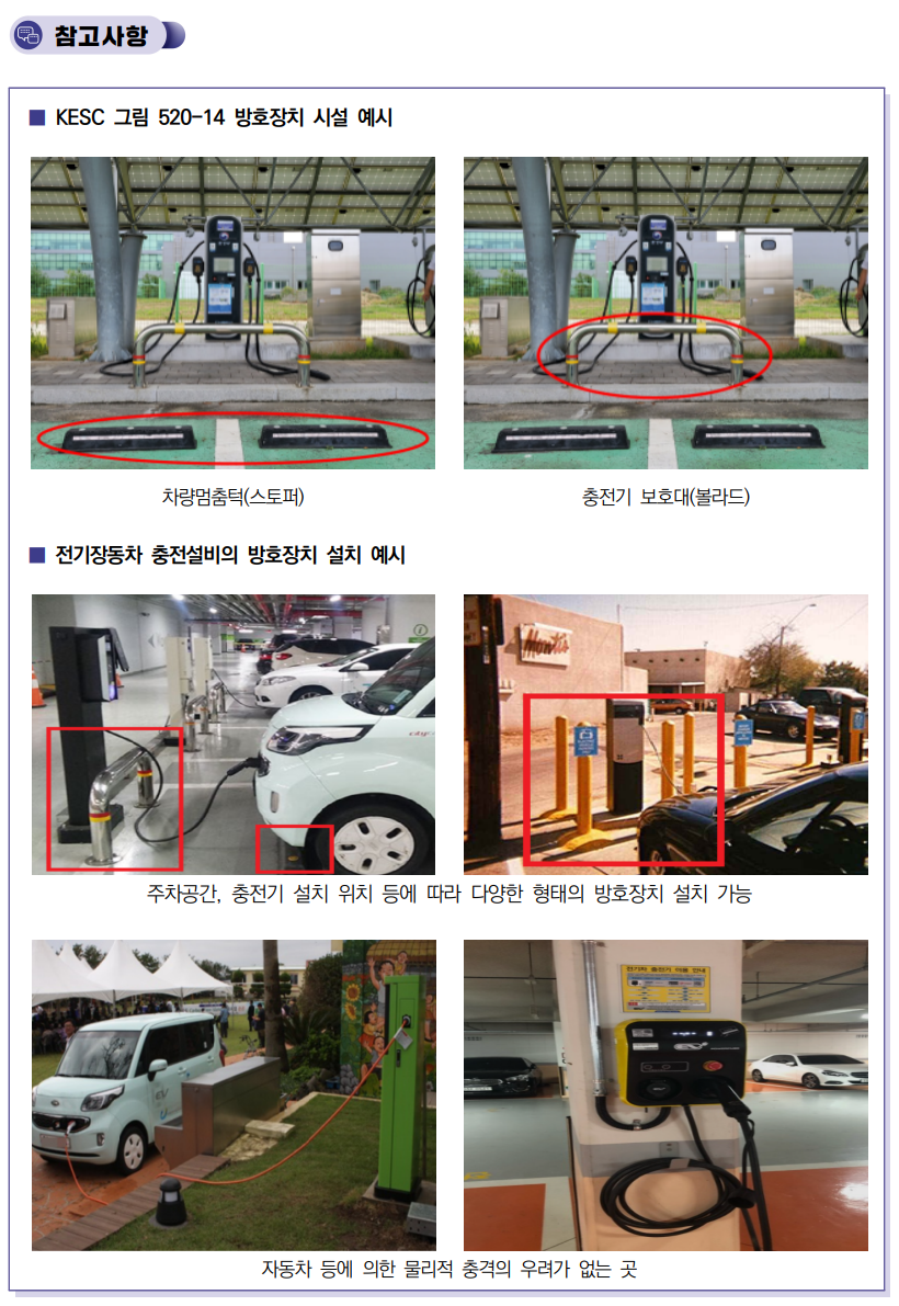 A1. KESC 520.10.6 (충전장소)의 '1'에 따라 '충전 중 차량의 유동을 방지하기 위한 장치를 갖추어야 하며, 자동차 등에 의한 물리적 충격의 우려가 있는 경우에는 이를 방호하는 장치를 시설하여야 한다'라고 정하고 있습니다.