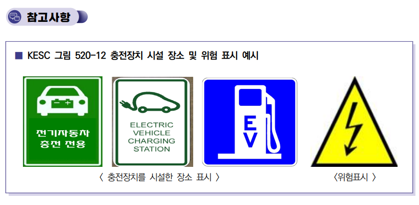 A1. KESC 520.10.4(충전장치 시설) 1의 '바'및 '사'에서는 충전장치에 전기자동차 전용임을 나타내는 표지를 쉽게 보이는 곳에 설치하고, 전기자동차의 충전장치 도는 충전장치를 시설한 장소에는 위험표시를 쉽게 보이는 곳에 표지하여야 한다고 정하고 있습니다.