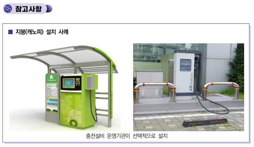 KESC 및 KEC에서는 전기자동차 충전시설의 지붕(캐노피) 설치에 대하여 정하고 있지 않으며, [전기자동차 충전인프라 설치,운영지침]에 따라 야외에 전기자동차 충전시설을 설치하는 경우에는 운영기관이 선택적으로 지붕(캐노피)를 설치할 수 있습니다. : 지붕(캐노피) 설치는 의무사항 아님