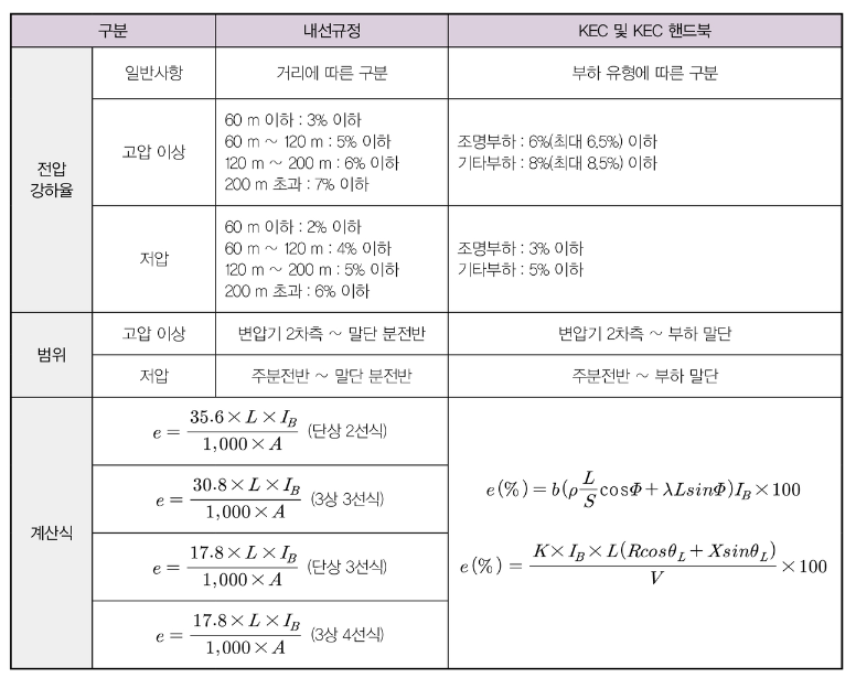 KEC 시행 이전의 전압강하 기준은 내선규정 제1415절 및 내선규정 부록 100-7에 따라 거리에 따른 전압강하율, 간이계산방식 등을 적용하였다. 제정된 KEC 핸드북에서는 부하 유형에 따른 전압강하율, 임피던스 계산방식등을 적용하도록