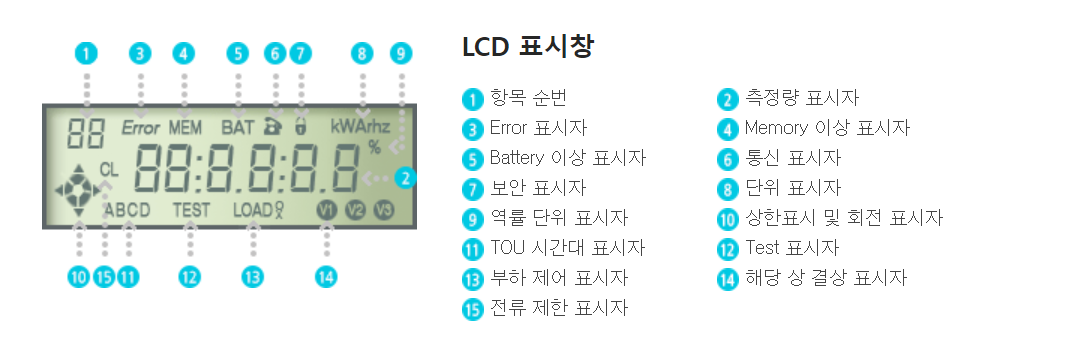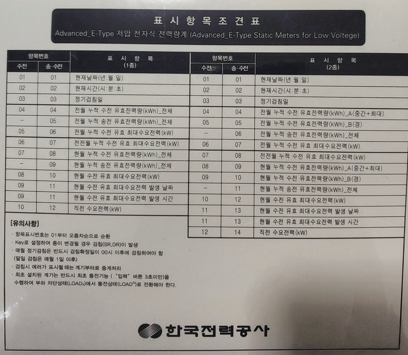 | 저압 전자식 전력량계 (E-type) | 유효전력량만 계량, 원격검침 가능함 (표시항목 변화 없으며 유효전력량만 표시됨) |
