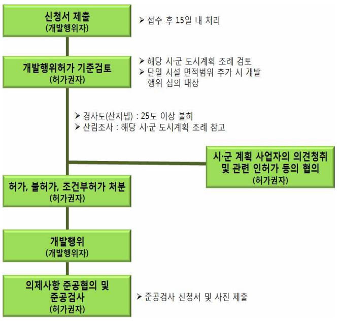 1) 건축물의 건축, 공작물의 설치 등을 하로자 하는 자가 [국토의 계획 및 이용에 관한 법률 (약칭 : 국토계획법)] 에 의하여 시장 또는 군수의 허가를 받는 행위말합니다. (발전사업 허가와는 별도)