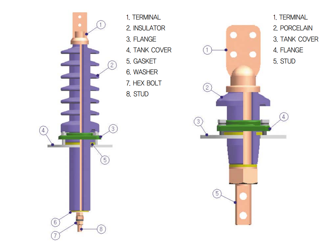 단일형 붓싱은 35kV 이하의 전압에 사용되며, 정격 선전류에 따라 4000A (암페어)용 까지 제작되어 있습니다. 터미날 정격 선전류의 크기에 따라 여러가지 모양이 있습니다. 아래 그림은 고압(좌), 저압(우)에 사용되는 대표적인 붓싱의 예입니다.